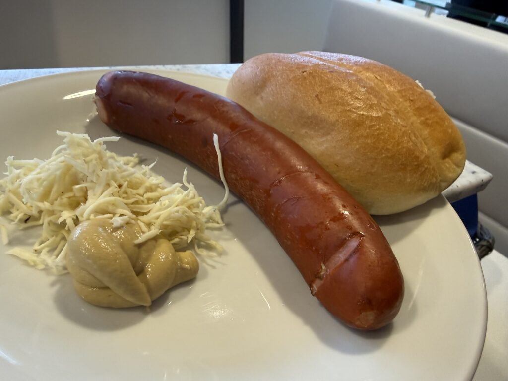 Eine Selchwurst mit Senf und Kren. Kein Käsekrainer – sondern ehrliche Faschingsenergie.