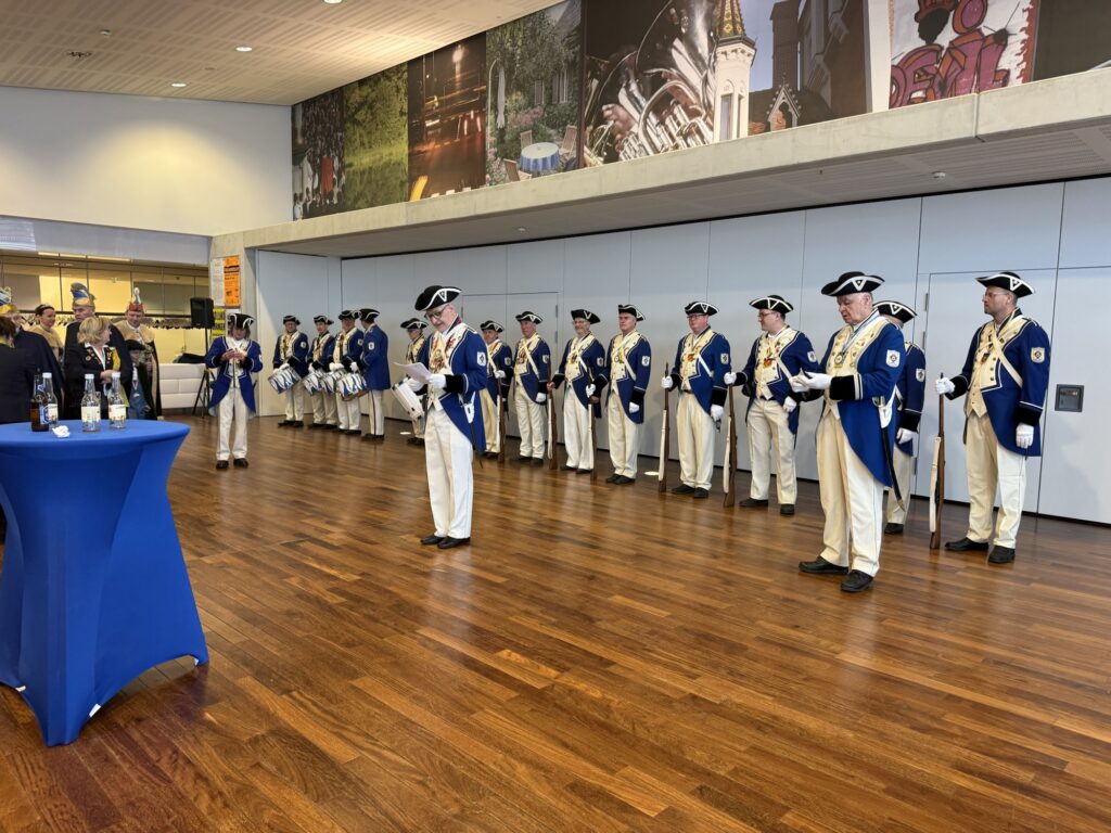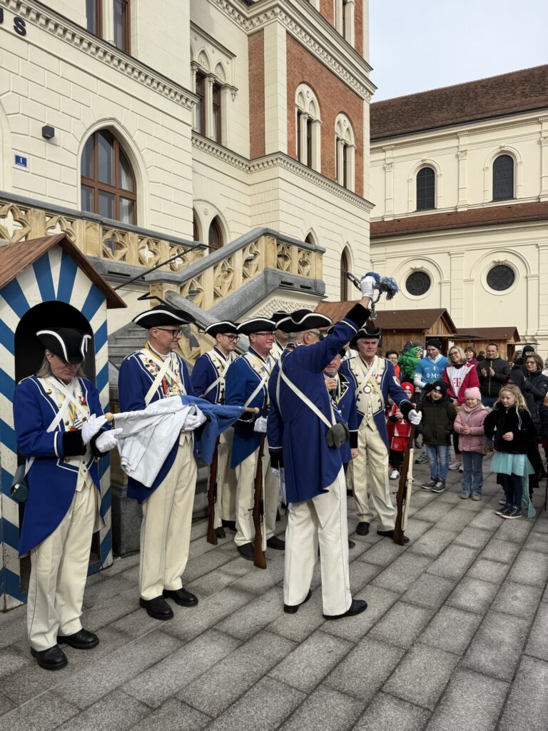 Andere Gilden trafen ein. Gespräche, Umarmungen, ein bisschen Lampenfieber vielleicht. Die Faschingsgarde des Kulturverein Stadtwache Feldbach nahm Aufstellung zur Ordensverleihung.